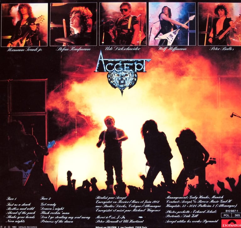 Ya que hablamos de letras, comentar que la mayoría de las mismas fueron escritas por Gaby Hauke, mujer de Wolf Hoffmann y mánager de la banda en ese momento. Vamos, una especie de nuestra Carolina Cortés a la alemana. Otra curiosidad es que Gaby figuraba con el pseudónimo de Deaffy porque, en esa época, no estaba bien visto que alguien externo a la banda, siendo además la mujer del guitarrista, figurase en los créditos. El bloque formado por Hoffmann, Baltes, Kaufmann y Dirkschneider se encargó prácticamente de todas las composiciones musicales.