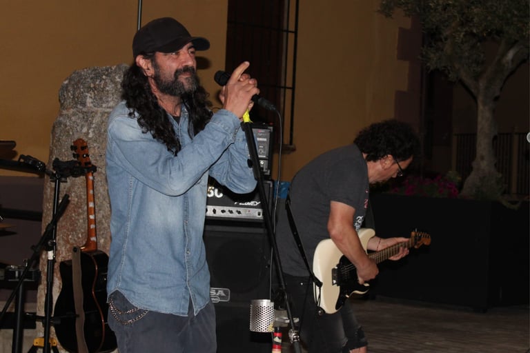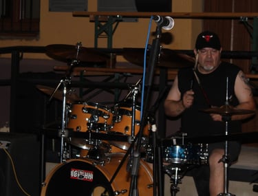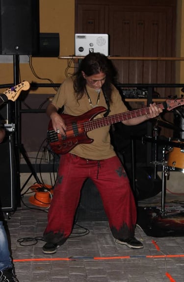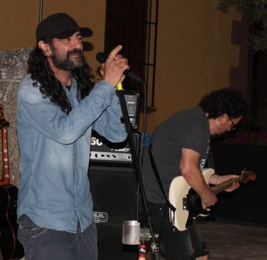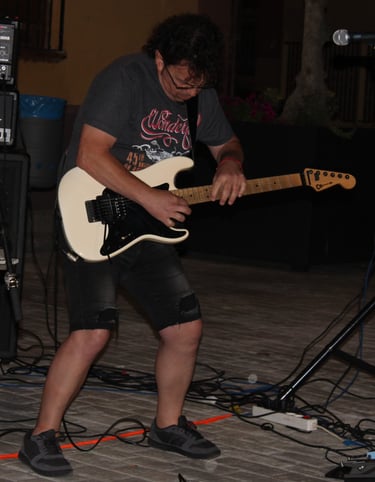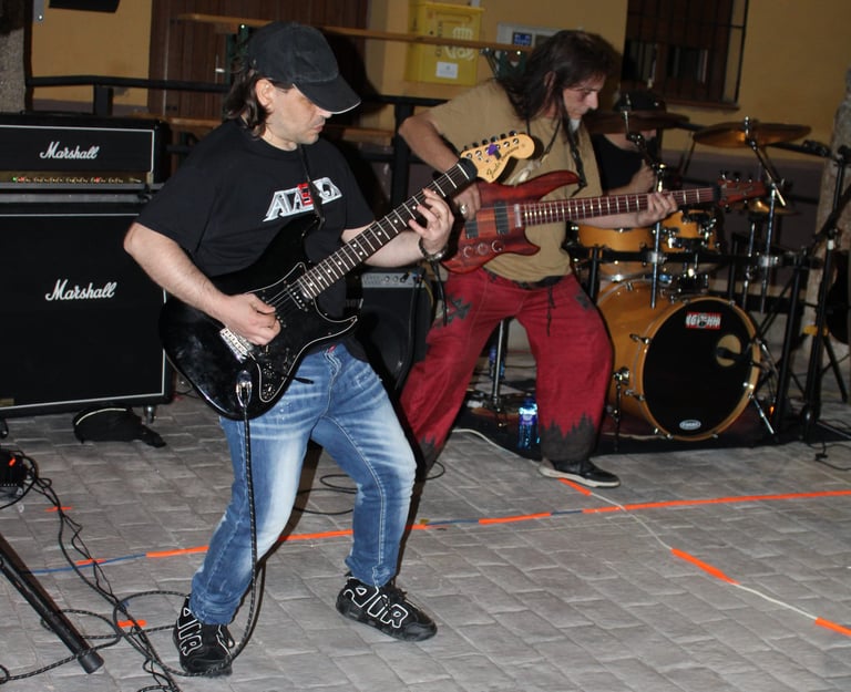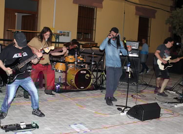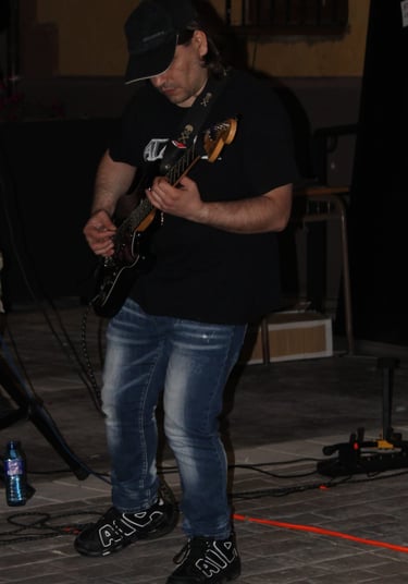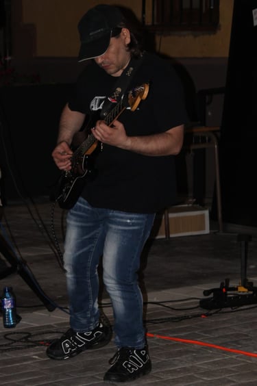El magnético bajo de Iñigo dio paso al que, para mí, es uno de sus mejores riffs (muy DIO, por cierto): "Pactos de Fe", durante el que se luce Pedro con un largo solo de guitarra que llega hasta el final del tema, solapándose incluso con la voz de Fer. A estas alturas ya se notaba a la banda caliente a pesar de la rasca que hacía, además, poco parecía importarles que estuviesen tocando ante solo un pequeño grupo de ilusionados rockeros (más algunos curiosos que se asomaban desde los distintas rincones de la plaza para ver como sonaba el grupo de Txelu); se les notaba con la misma ilusión y entrega que tendrían en un pabellón repleto.