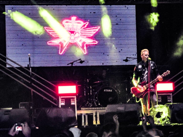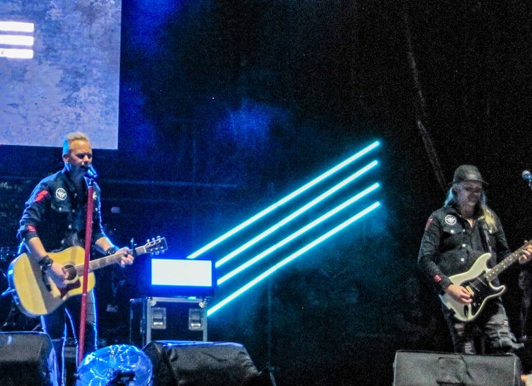 Tras una curiosa intro con fragmentos de clásicos de los 80 (Scorpions, Megadeth, Motley Crue, …) los músicos saltan a escena uniformados con una casaca “casimilitar” pero en la que lucen el logo de la banda en vez de los típicos galones, la primera en sonar fue “Roses on Your Grave”, justo una de las que había echado de menos en Cartagena, así que mejor arranque imposible. Al igual que en el Rock Imperium el escenario estaba presidido por la llamativa batería de la que salían varias barras de luces de neón, que al ser de noche dio mucho más juego al iluminarse dichas barras al son de la música, al igual que siempre luce más por la noche la pantalla trasera que no deja de proyectar distintos logos de la banda dependiendo del tema que suena, como punto negativo, el escaso juego de luces con el que contaron y sobre todo la poca iluminación delantera que dificultaba el ver con claridad a los músicos durante varias partes del Show, pero bueno, supongo que el presupuesto al alcance de la organización da para lo que da y priorizan otras cosas como el sonido (en realidad lo más importante). Fue con la marchosa “Got It!” con la que me di cuenta de que en nuestra posición los coros no parecían sonar todo lo altos que debían, así que recurrimos al viejo truco de acercarse a la mesa de mezclas para encontrar la mejor sonoridad posible, y efectivamente en esa nueva localización el sonido mejoró muchísimo, como ya he dicho, para mi gusto el mejor con el que he disfrutado de los suecos en las todas veces que los he visto.