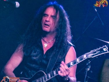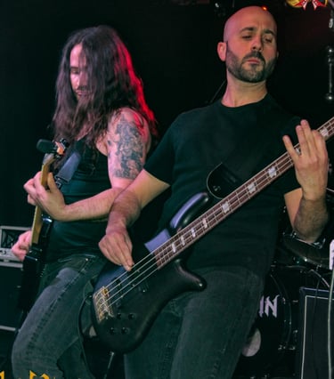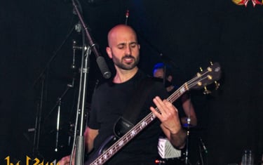 Marc nos recuerda que vienen a presentar su nuevo disco "Dimensión V", del que interpretan "Renacer", tema que ya fue lanzado en 2020 con una formación "provisional" y que ha sido recuperado para la nueva entrega de la banda, durante este tema se hizo presente el insuficiente juego de luces de la sala, que al intentar acompañar con el mismo la parte rápida del tema, lo único que consiguió fue quedarnos casi a ciegas tanto a público como a banda, por suerte ese aspecto fue superado por la solvente interpretación de los músicos. Bajamos un poco las revoluciones con "Más allá del cielo", para retomarlas de inmediato con "Tres y el Apocalipsis", otro clásico de esos que la mayoría de la gente se sabe y disfruta un montón, destacando el momento de su épico solo. Aparcamos la nostalgia para volver de nuevo a la actualidad con "Vivir-morir", uno de los temas que más me gusta de su último disco y durante el que me pasé gran parte del mismo analizando las evoluciones de Juan Manuel Salas con su bajo de cinco cuerdas, de la velocidad a la que iba y lo dañados que están mis ojos, no logré averiguar si llegó a utilizar las cinco o no.