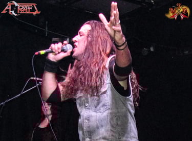 Aunque lejos de óptimo, el sonido era bastante aceptable y suficiente para disfrutar del buen hacer de los granadinos. La banda empezó puntualmente con dos cañonazos de “Dimensión IV”, uno de sus trabajos más aclamados y con razón por lo visto en la sala, en concreto “Nada que temer” y “Sentencia”, por lo visto era de los pocos “pecadores” que todavía no era seguidor de la banda, porque la mayoría de los allí presentes se sabía prácticamente todas las canciones y las cantaba de principio a fin, como si de clásicos de Maiden se tratase. A pesar de las idas, vueltas, venidas, huidas… de los últimos tiempos en la banda, todos los músicos están a muy buen nivel y suenan totalmente compenetrados, pero me gustaría destacar la labor del balear Marc Riera, que además de ser un buen vocalista, me sorprendió más como frontman, es de esos tíos que llena el escenario por sí solo (Y no únicamente por lo grandullón que es) sabiendo contagiar su buen rollo al público, ayudado siempre por los contagiosos estribillos de la mayoría de las canciones de la banda que funcionan a la perfección en vivo. Es muy de agradecer que mientras muchas bandas noveles optan por teclados enlatados, ellos se permiten el lujo de contar con Zoraida Vidal cuyas teclas aportan mucha calidad y autenticidad sobre el escenario. No nos podemos olvidar del bajo de Juan Manuel Salas (Único miembro original) que junto a la batería de Tino Torres (Que afronta su segunda etapa en la banda) llevan en volandas al resto, y, por supuesto, a Enrique J. Rosales (Parte fundamental en los coros) y Oscar Espín (La más reciente incorporación), que para mí fueron uno de los mayores atractivos del directo con esos juegos de guitarras veloces y dobladas que dan a Azrael ese toque tan Power Metal que siempre han tenido.