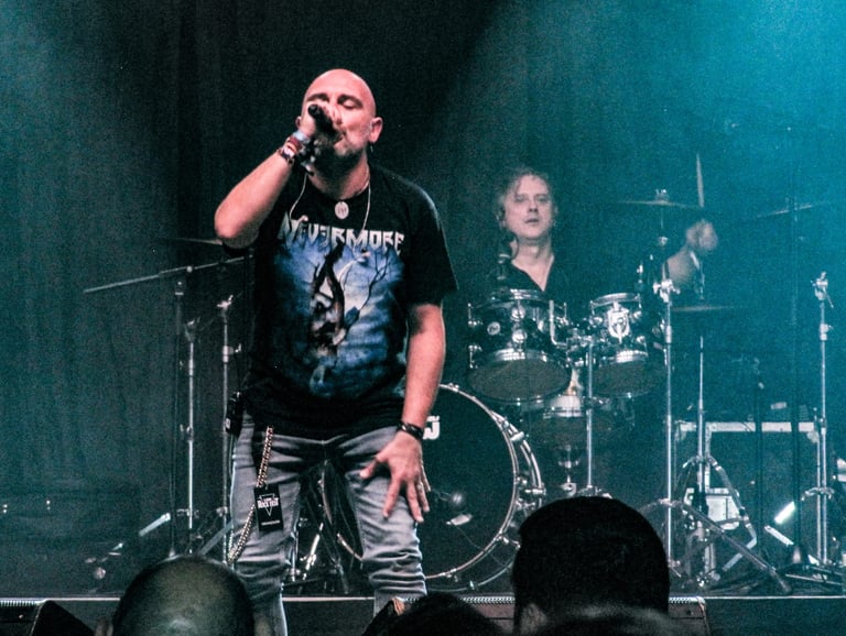 Hace poco más de un mes que los había disfrutado en directo en circunstancias completamente diferentes en la Revi Live, una de las mejores salas y con mejor sonido de Madrid. Esta vez tocaba un pub con una curiosa distribución y un minúsculo escenario en el que prácticamente ni cabían. De hecho, me costó encontrar a su bajista Sergio Hunter más de la mitad del concierto, con lo que me llegué a plantear que se habían marcado un Powerwolf y llevaban el bajo enlatado. Por suerte no fue así y, con ayuda de mi compañero de "safari", comprobé que estaba "escondido" tras uno de los altavoces.