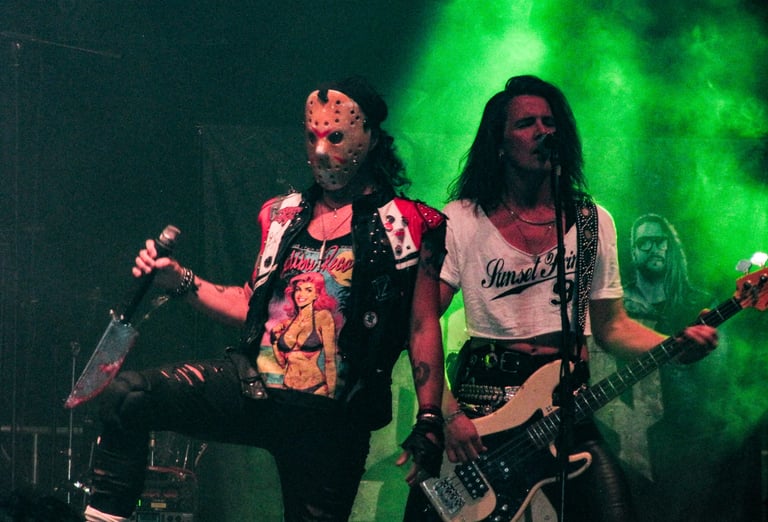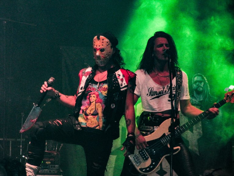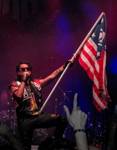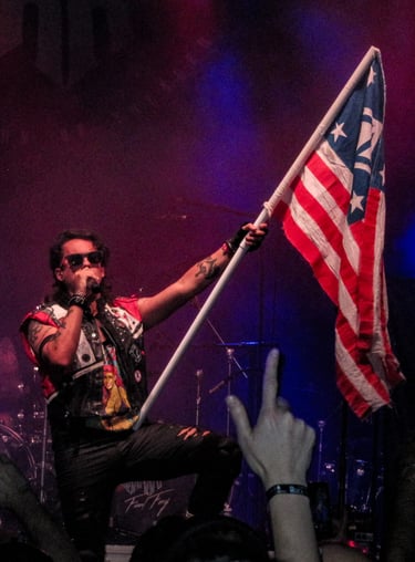 Siguieron con la contundente “Anthem for America” de su última entrega Street Lethal, donde Danny sacó una bandera parecida a la de USA pero aderezada con su logotipo, que dio vistosidad al Show y todavía nos trasportó más a nuestra época favorita. Los que somos seguidores de la banda sabemos de la importancia de los coros y lo difícil que puede resultar reproducirlos en directo, después de la sensación que me dio en vivo y tras analizar detenidamente varios vídeos de la actuación, podría concluir casi al 100% que parte eran interpretados en directo y parte pregrabados para intentar trasmitir las mismas sensaciones que cuando lo escuchas en disco ¿Sería preferible llevar un par de coristas para dar más autenticidad a la propuesta? Pues sí, pero sólo bandas como Avantasia o The Night Flight Orchestra parece que se lo pueden permitir hoy en día, a mí personalmente no me molesta. Aunque ya habíamos dejado atrás Halloween, Danny quiso amortizar su disfraz de Jason con micrófono-cuchillo incluido, así que lo lució durante “XIII” ¿Hay algo más ochentero que Viernes 13?.