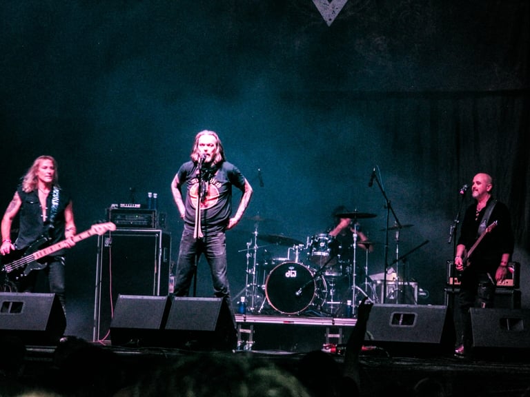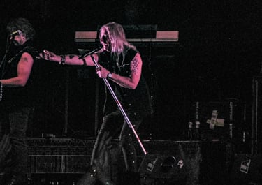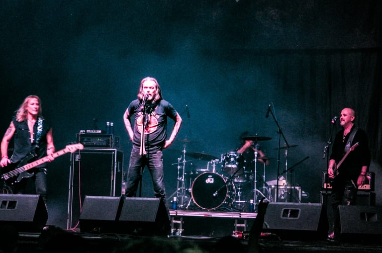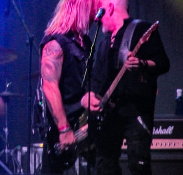 El primer viaje al pasado corre a cargo del poderoso riff de "Ready for the Taking", tema ideal para seguir caldeando el ambiente con sus poderosos coros, muy fáciles de seguir por el público aunque ni conozcas la canción, es ahí justo donde puedo comprobar que aunque pueda haber pistas pregrabadas para los coros, la banda no deja de realizar los suyos propios en directo.
