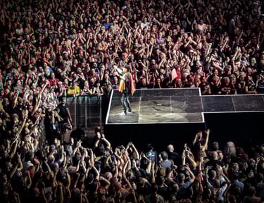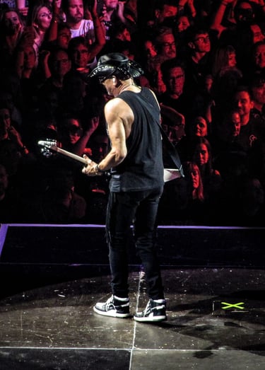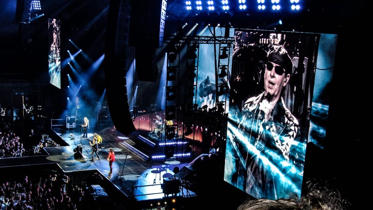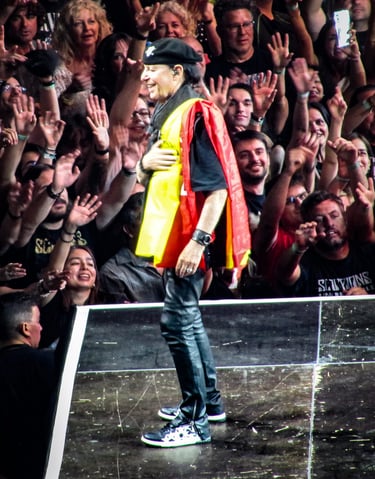 Si, si, si … “Send Me an Angel” y “Wind of Change” son muy moñas y todo el mundo dice estar hasta los webs de escucharlas (Sobre todo los aficionados a Rock FM), pero siempre acaban convirtiéndose en uno de los momentos álgidos de sus actuaciones, y más cuando las tocan en su versión original y no en acústica como hacen en otras ocasiones. Que alegría me llevé en su día cuando “Wind of Change” fue elegida como el himno de la caída del muro y el fin de los “dos mundos” que existían hasta ese momento, una pena que tanto “hijo de Putin” quiera volver a las andadas no dejando de levantar nuevos muros (aunque sean virtuales). Me aventuré a inmortalizar el momento grabándolo con mi móvil, ya que mi hija me lo encargó, pero me fue imposible ya que en el afán de coger el mejor sitio, el personal de seguridad, con buen criterio, me pidió “amablemente” que abandonase las escaleras, en realidad no creo que sea problema que no lo pudiese grabar completo, ya que podría asegurar que prácticamente el 90% de los presentes sí lo hicieron y hay muchas versiones subidas a la red.