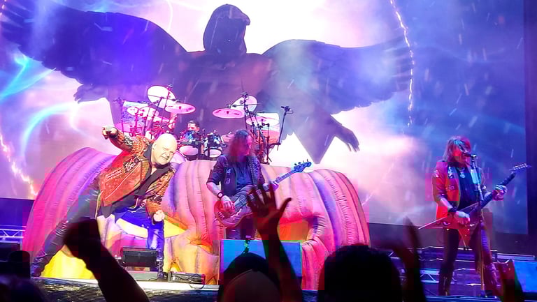 Michael Kiske toma el protagonismo con uno de los temas más deseados por el público “Eagle Fly Free” en el que demuestra que está a un buen nivel vocal y que canta a medias con el público en muchos de sus tramos, mientras un tremendo águila sobrevuela nuestras cabezas en la gran pantalla trasera. En las partes más agudas del tema se percibe por primera vez el tan socorrido delay para dar esa impresión de que el agudo se alarga más, aun así no considero que sea una ayuda que desvirtúe el buen estado vocal del admirado vocalista.