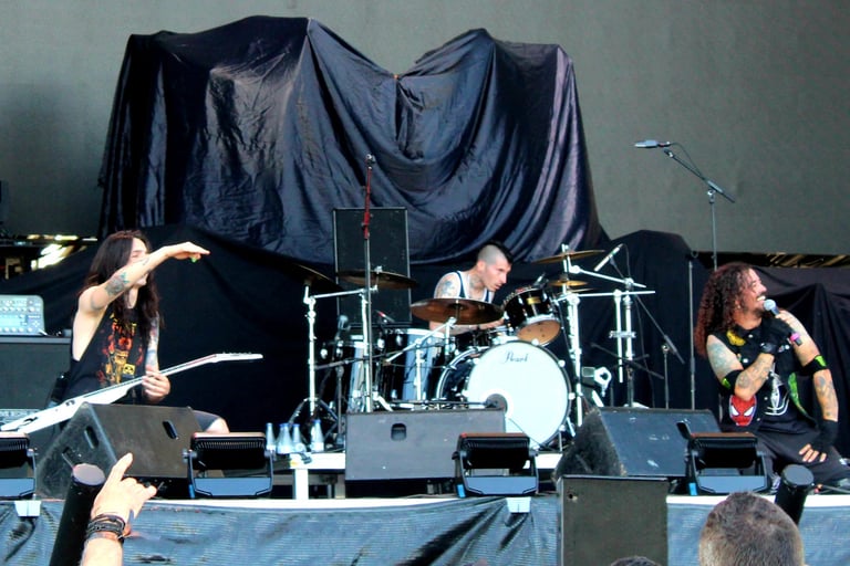 Después de “Get Out of My Head” y enfilando el final de la actuación, otro guiño a ANTRHAX intercambiándose los instrumentos como estos ya hacían en su época dorada, en este caso para mostrarnos una pequeña medley de temas de Metallica, Pantera y los mismos ANTHRAX.